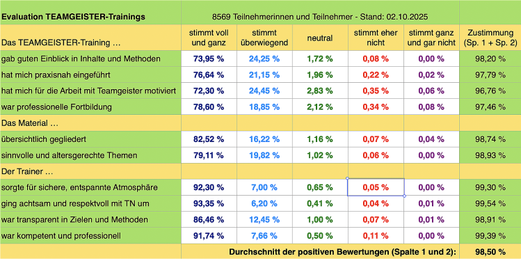 Wir fragen nach jeder Fortbildung die Teilnehmerinnen und Teilnehmer, wie zufrieden sie mit der Fortbildung, dem Material der Teamgeister und mit der Leitung sind.